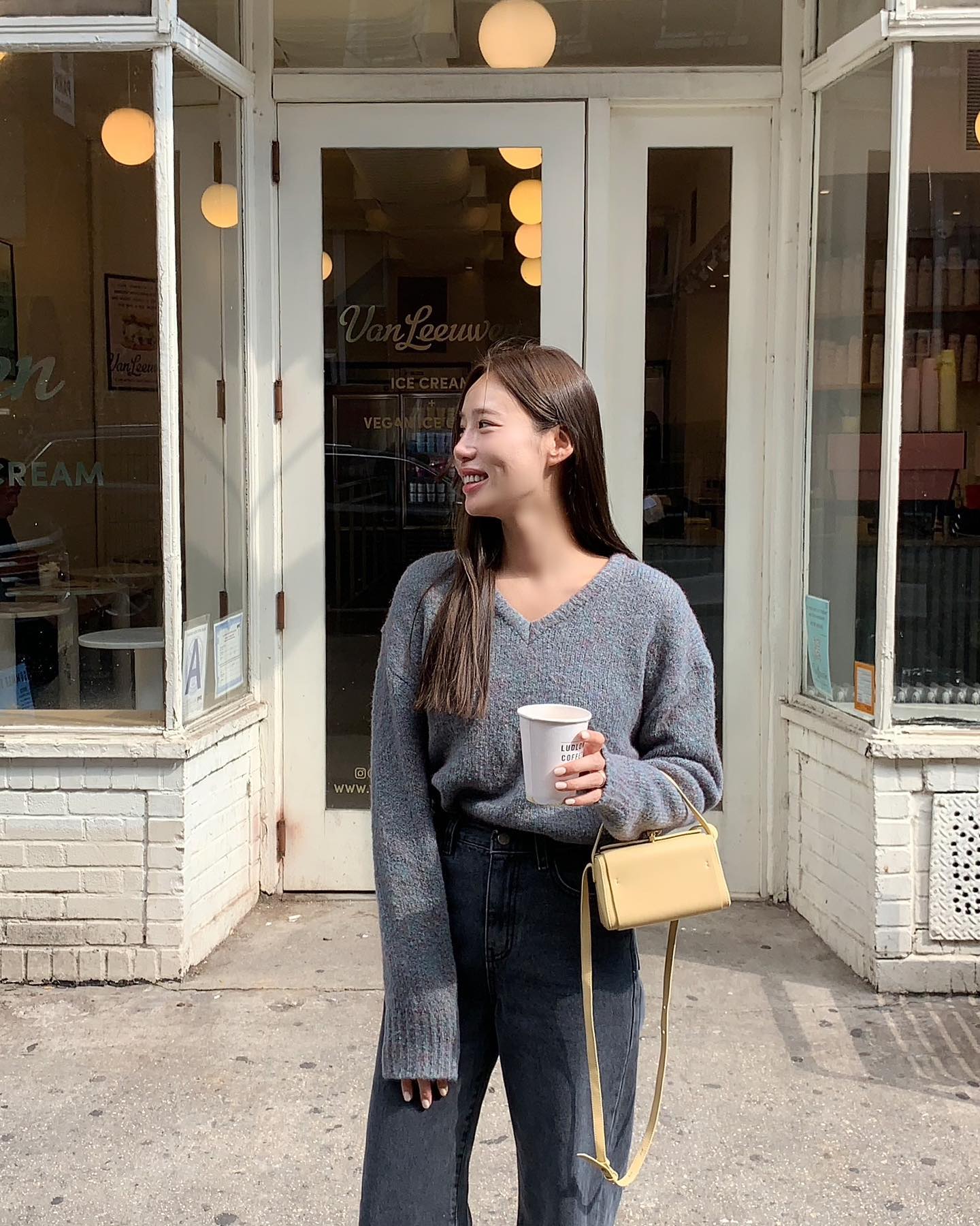 Công thức áo len layer với sơ mi không quá mới, nhưng vẫn luôn chuẩn mốt mỗi khi đông về. Combo này có sự đan xen của nét trẻ trung và thanh lịch. Vẻ ngoài sẽ được hack tuổi hiệu quả hơn nếu bạn kết hợp bộ đôi áo len + sơ mi với quần jeans xanh, và túi xách mang tông màu trắng.