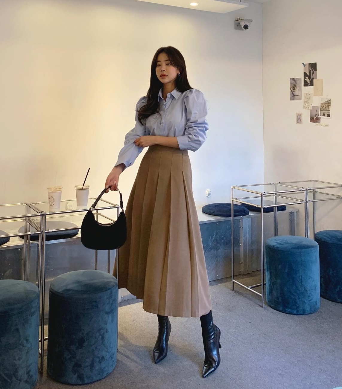 Áo sơ mi xanh pastel và chân váy màu be ghi điểm ở sự trang nhã, trẻ trung. Muốn bảo toàn vẻ thanh lịch cho outfit, các nàng nên chọn giày dép và túi xách thiết kế đơn giản, mang tông màu trung tính.