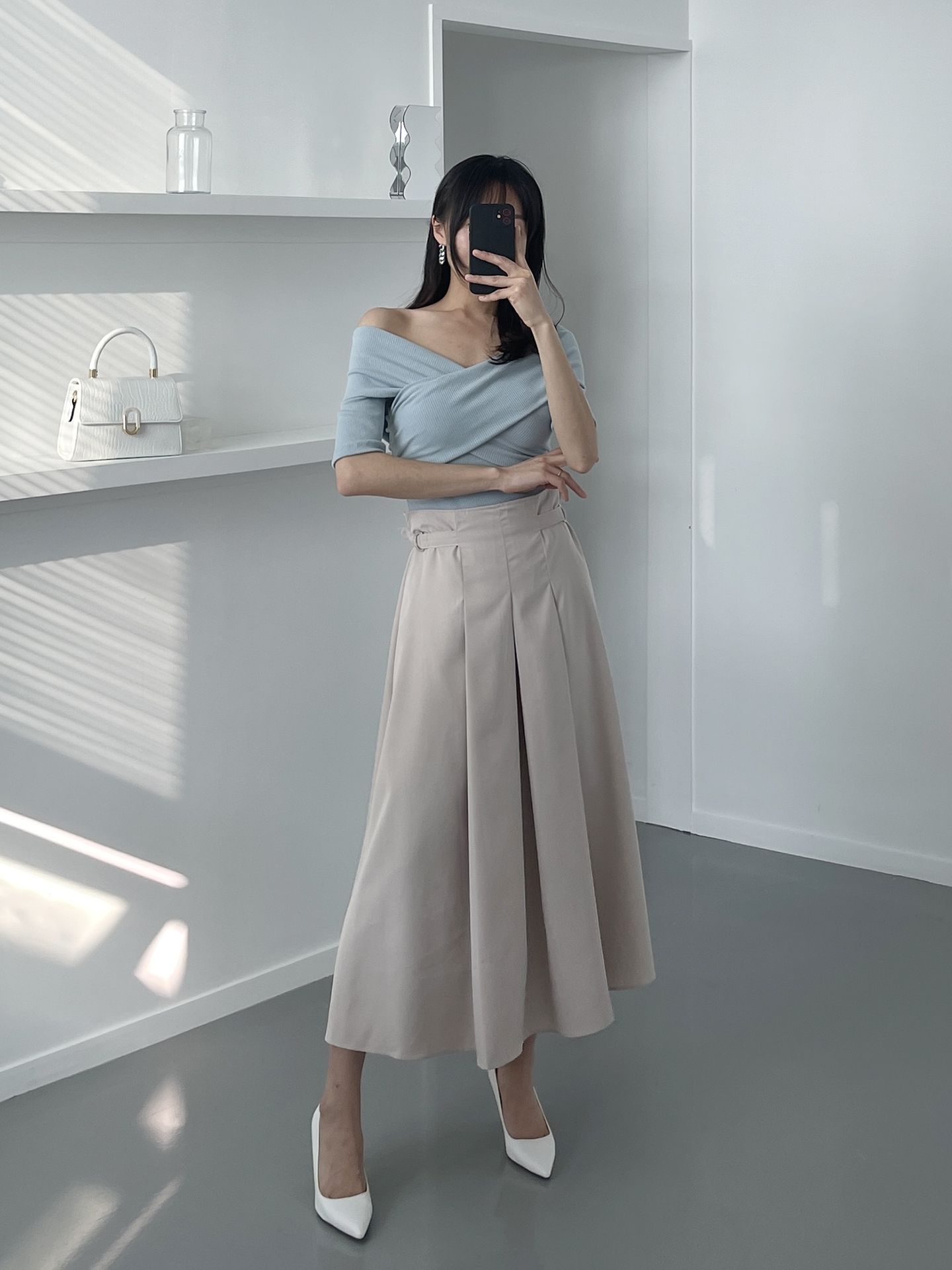 Đơn giản nhưng vẫn ghi điểm phong cách là công thức áo sơ mi trắng kết hợp với chân váy xếp ly. Combo này lý tưởng để chị em diện đến công sở. Để không làm giảm nét thanh lịch và tinh tế của tổng thể trang phục, các nàng hãy chọn giày búp bê mang tông màu trung tính, thiết kế giản đơn.