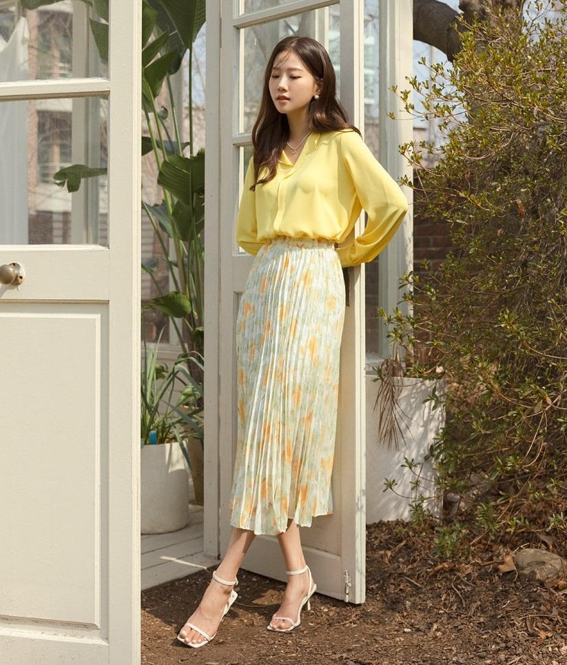 Thêm một công thức diện chân váy xếp ly đậm chất hè mà chị em có thể tham khảo, đó là combo áo sơ mi tông màu vàng kết hợp với chân váy họa tiết hoa. Nổi bật và tươi trẻ là vậy nhưng set đồ vẫn có sự hài hòa. Đôi sandal quai ngang tăng vẻ trang nhã cho outfit, đồng thời giúp hack dáng tối ưu.