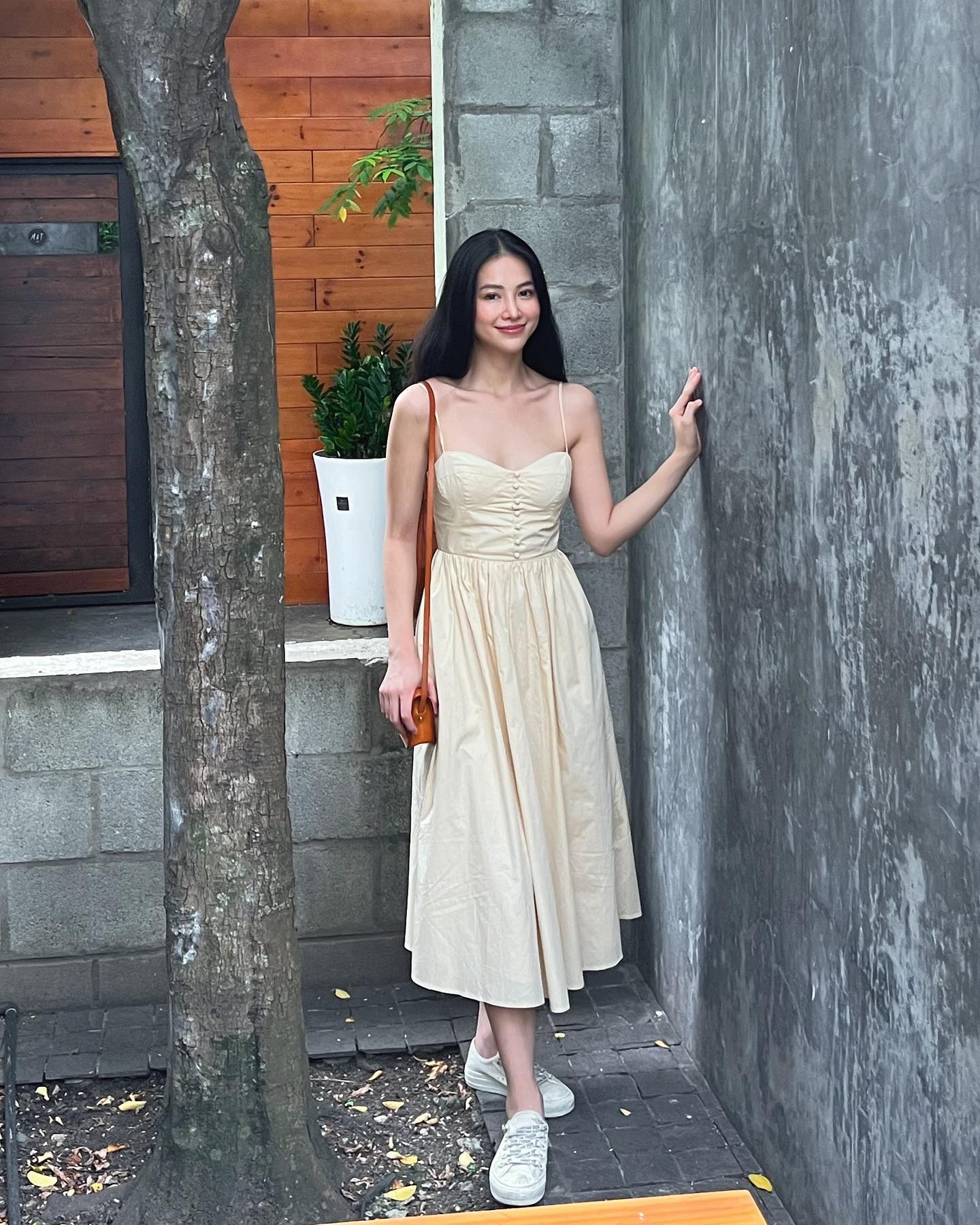 Váy hai dây là món thời trang rất phổ biến trong mùa hè. Phiên bản đơn giản, dễ mặc nhất chính là váy hai dây mang tông màu be. Đôi sneaker trắng mang đến hiệu quả "hack" tuổi, chiếc túi xách tông màu nâu cộng thêm điểm tinh tế, sang trọng cho oufit.