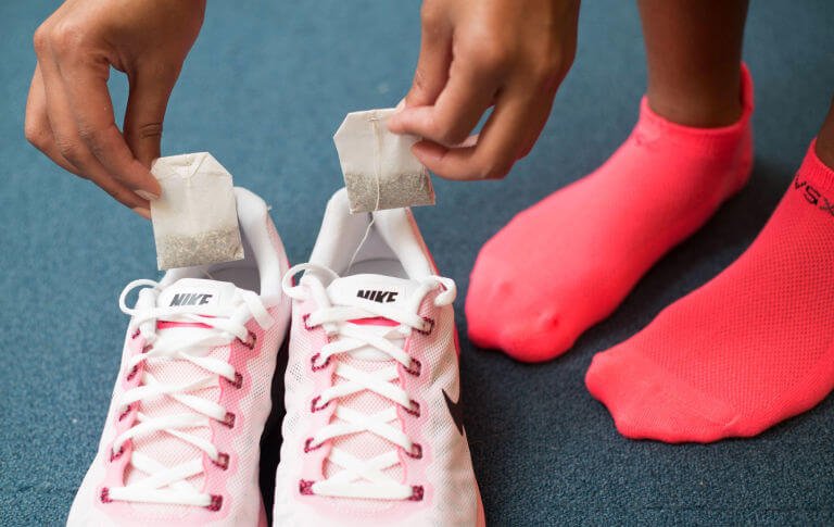 Trà khô có tính chất hút mùi, khử khuẩn nên giúp làm giảm mùi hôi của giày. Bạn cho trà vào túi vải hoặc túi giấy mỏng rồi bỏ vào trong giày, để như vậy qua đêm. Sáng hôm sau, mùi hôi giày sẽ giảm đáng kể. Bạn có thể chọn loại trà có mùi thơm để đạt được hiệu quả cao hơn.