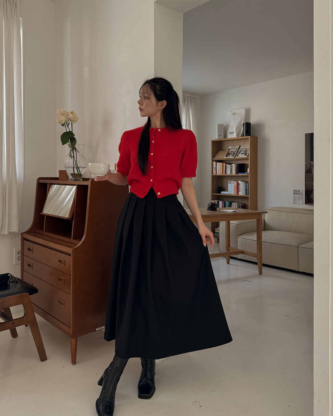 Áo len cộc tay là lựa chọn lý tưởng cho dịp Tết vì sự nữ tính, trẻ trung. Mẫu áo này kết hợp rất ăn ý với chân váy chữ A, tạo nên bộ trang phục bay bổng và sành điệu. Thay vì chọn boots đen, chị em hãy ưu tiên boots trắng để outfit thêm tươi tắn, nổi bật.