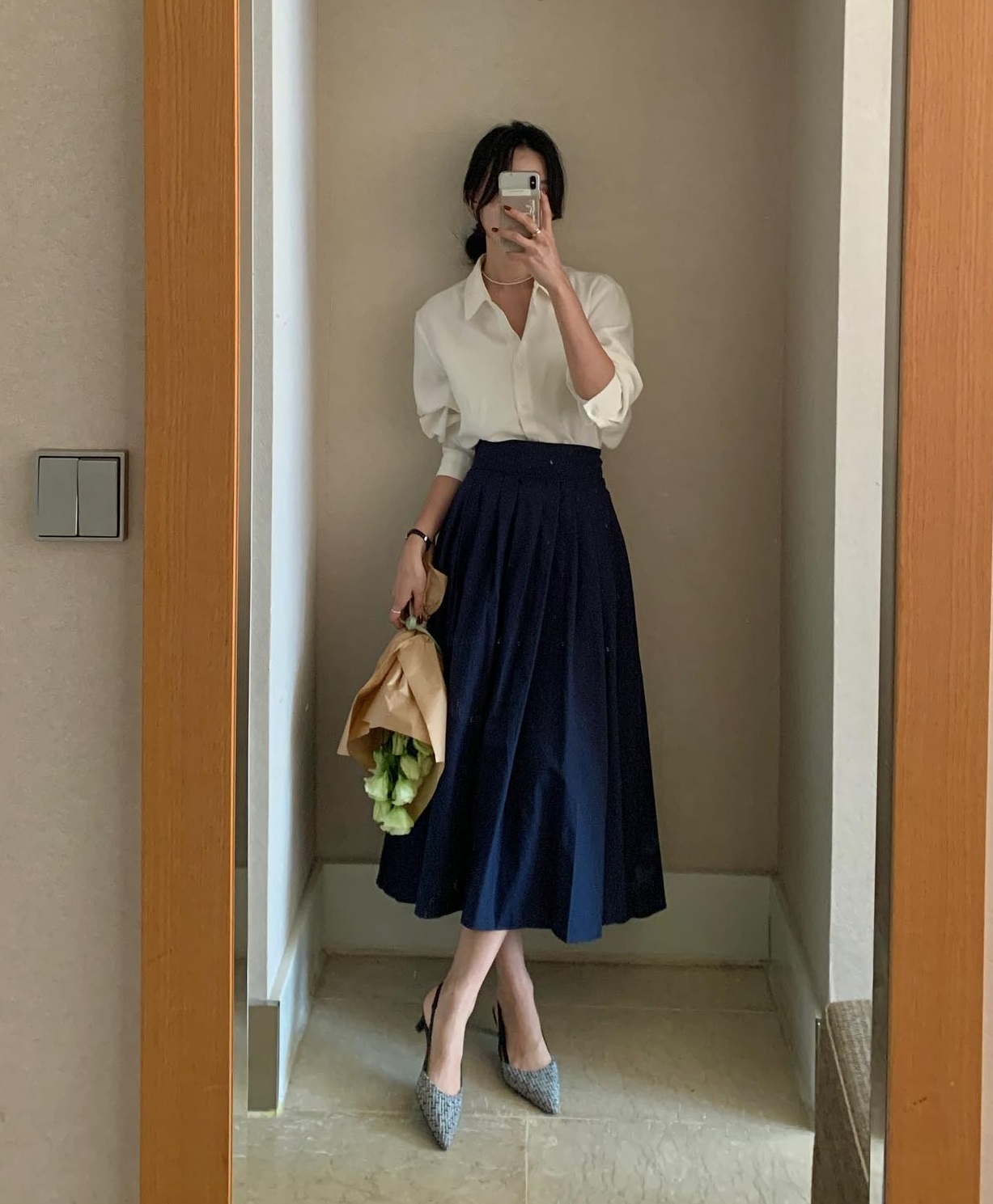 Yêu thích sự đơn giản, chị em hãy tham khảo công thức gồm áo sơ mi trắng kết hợp với chân váy xếp ly mang tông màu xanh navy. Dù không cầu kỳ nhưng tổng thể trang phục trên vẫn hút mắt, đặc biệt là khi được hoàn thiện bằng vòng cổ ngọc trai và đôi giày slingback mũi nhọn.