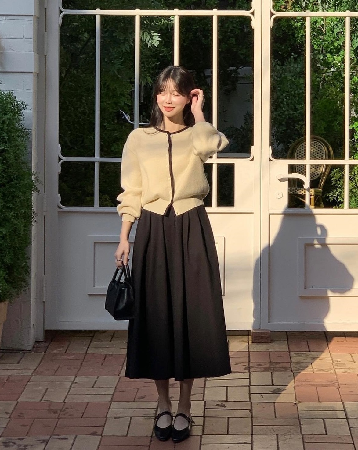 Áo cardigan và chân váy dài sẽ mang đến cho chị em vẻ ngoài nữ tính, dịu dàng. Đây là công thức nàng nào cũng có thể chinh phục được. Tổng thể trang phục trở nên yêu kiều hơn khi được tô điểm một đôi Mary Jane.