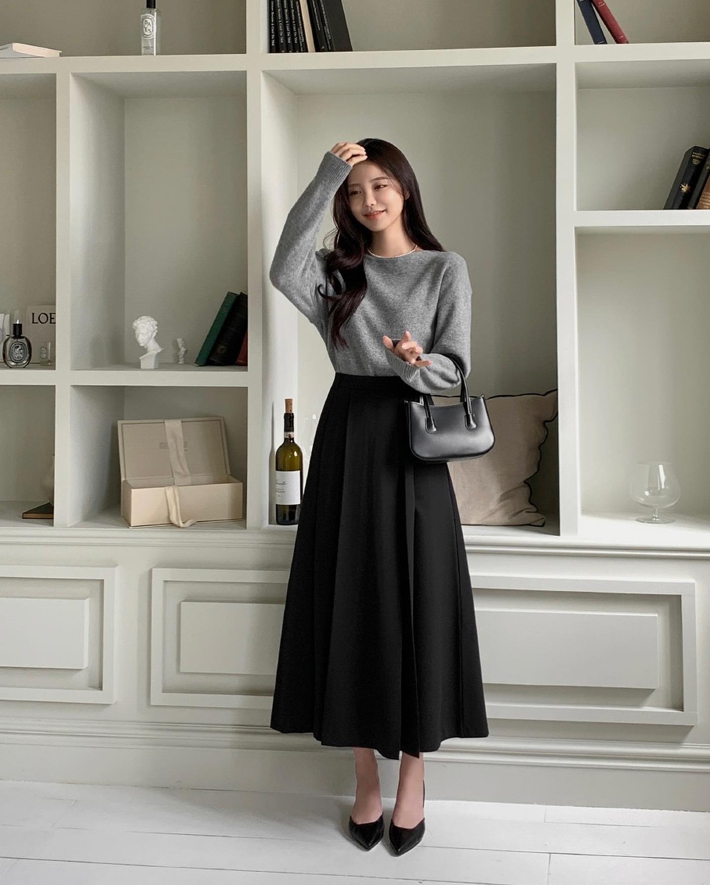 Những nàng theo đuổi phong cách tối giản đừng bỏ qua công thức gồm áo len xám kết hợp với chân váy đen. Chỉ cần sơ vin gọn gàng và đi giày cao gót mũi nhọn, chị em sẽ có ngay vẻ ngoài sang trọng, yêu kiều.