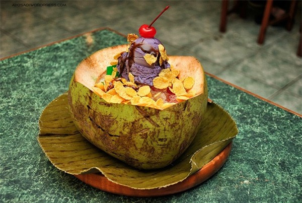 Halo-halo: Một lựa chọn khác cho tráng miệng là halo-halo. Món này thường có nhiều màu sắc rực rỡ, gồm caramen, sữa đặc, kem lạnh, đá bào, thêm nhiều loại quả khô, đậu, trân châu..., bày trong cốc hoặc quả dừa. Chẳng còn gì tuyệt bằng được thưởng thức một cốc halo-halo mát lạnh giữa ngày nóng bức ở Philippines. Ảnh:Ayosaoi/Wordpress.