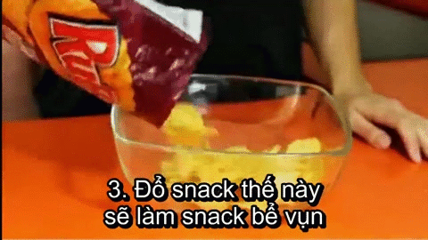 Món snack để trong các túi, nếu thò tay xuống để lấy thì bẩn tay mà đổ ra bát lại lại mất công. Chỉ việc mở to miệng túi và dồn snack lên trên là bạn có thể lấy ăn dễ dàng rồi!