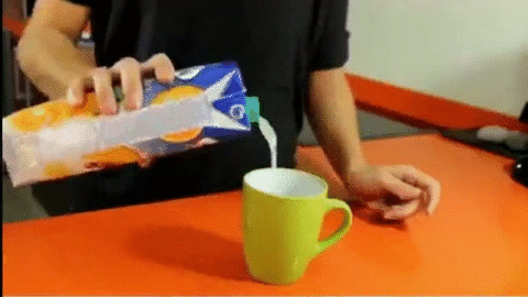 Hãy để miệng hộp sữa lên phía trên gần tay bạn thay vì gần cốc, như thế sữa sẽ không bị văng ra ngoài do áp lực sữa từ bên trong.