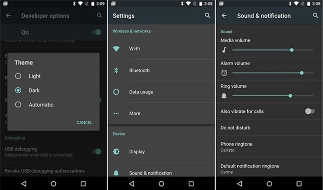Nhiều khả năng Android N sẽ bổ sung Theme Dark nhằm tăng khả năng tiết kiệm pin cho thiết bị. Trước đó, Theme Dark đã được tích hợp vào phiên bản thử nghiệm của Marshmallow nhưng ở bản chính thức, nó hoàn toàn biến mất.