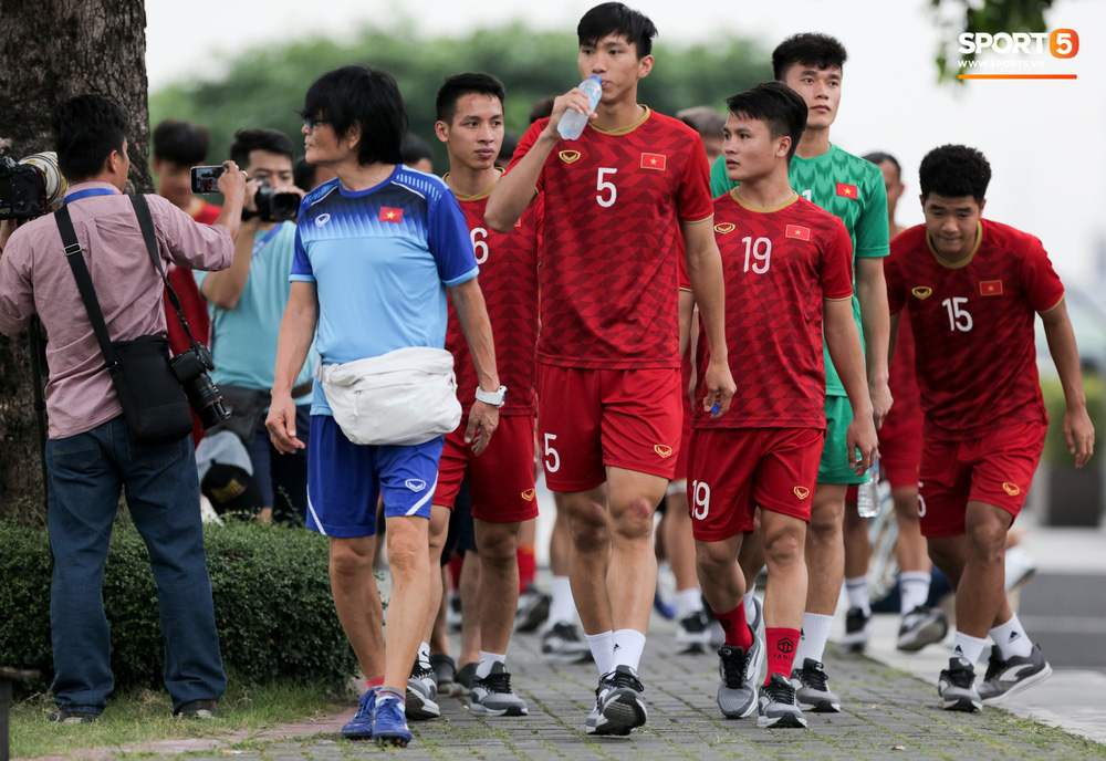 Cầu thủ được khuyên nên dùng bình nước cá nhân. Ở các trận đấu bình thường trước dịch, các chai nước được dùng chung nhiều. Ảnh: Hiếu Lương.