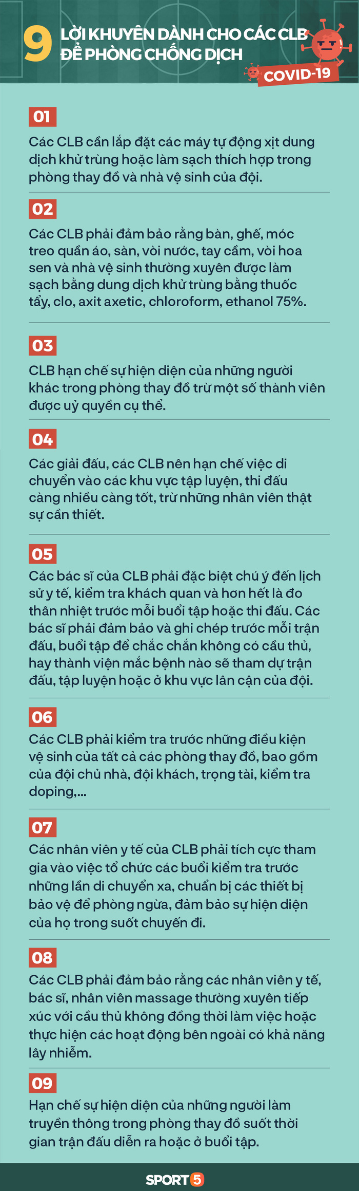 Dưới đây là 10 lời khuyên chi tiết của FIFPRO dành cho các cầu thủ và 9 lời khuyên dành cho các CLB thời dịch Covid-19.
