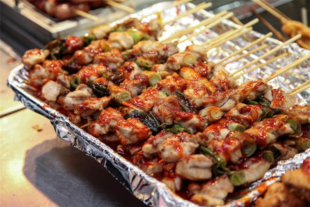 Đến Hàn Quốc cũng không thể bỏ qua dakkochi. Món xiên gà rán thơm lừng này được thường phủ xốt tương ớt hay tương đậu nành mang hương vị cay nồng đặc trưng của ẩm thực Hàn Quốc.