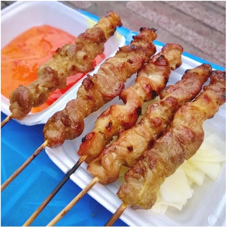 Thịt xiên nướng là món đặc sản “xuất xứ” từ Hà Nội rất được các bạn trẻ yêu thích. Xiên thịt vàng ươm, thơm lừng, gia vị đậm đà, khá vừa miệng. Giá cả lại “rẻ bất ngờ” chỉ 6.000 đồng/xiên khiến ai đã ăn khá dừng lại chỉ với 1 xiên. Ngoài ra, tại thiên đường ăn vặt trước cổng trường Marie Curie này, bạn có thể tìm được trà sữa, thịt xiên nướng, há cảo, mì xào với giá cả vô cùng “học sinh”.