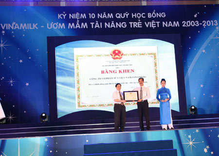 Bộ Giáo dục & Đào tạo cùng với Công ty Cổ phần Sữa Việt Nam - Vinamilk vừa tổ chức Lễ kỷ niệm 10 năm Quỹ học bổng “Vinamilk - Ươm mầm tài năng trẻ Việt Nam” năm học 2012 - 2013 và Sân chơi “Tỏa sáng tài năng Việt” cho các em HS tiểu học.