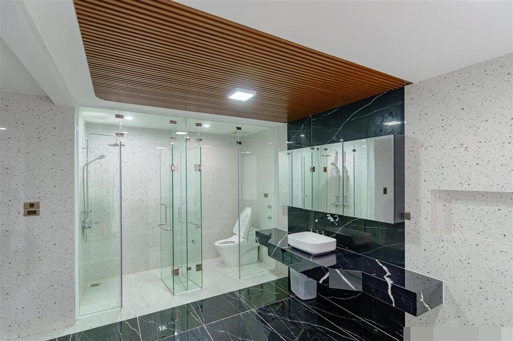 Khu vực tắm view thiên nhiên, có phòng tắm đứng, bồn tắm ngâm và 1 vệ sinh tách biệt.