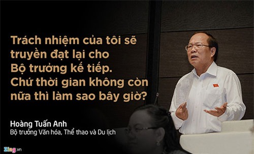 Phần trả lời của Bộ trưởng Tuấn Anh vừa kết thúc, Chủ tịch Quốc hội Nguyễn Sinh Hùng đã hóm hỉnh: “Bộ trưởng cho Quốc hội đi du lịch rất mệt!”. Ở lần chất vấn vài năm trước, ông Hùng từng nhắc nhở Bộ trưởng Du lịch: "Bay ra bay vào nhiều quá!".