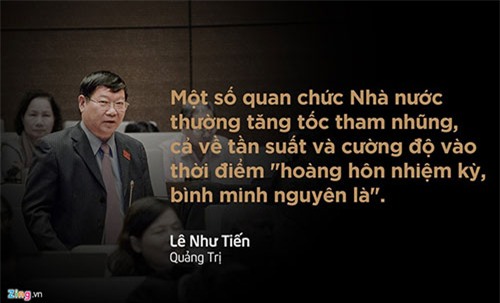 Chất vấn Tổng thanh tra Chính phủ Huỳnh Phong Tranh về tình trạng tham nhũng gia tăng vào thời điểm sắp kết thúc nhiệm kỳ, đại biểu Lê Như Tiến đề nghị cần có giải pháp "chặn đứng quan chức chạy đua nước rút thực hiện những chuyến tàu vét cuối cùng".