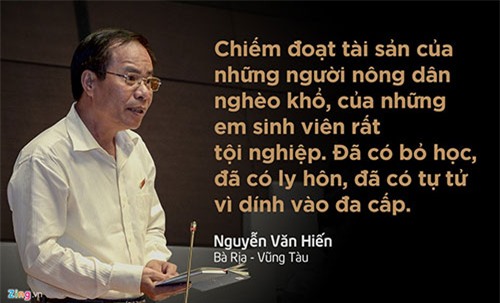 Kinh doanh đa cấp biến tướng, ở mức rất nghiêm trọng, nhiều người tự tử, ly hôn, bỏ học vì dính vào đa cấp.Tuy nhiên, theo đại biểu Nguyễn Văn Hiến, Bộ Công Thương phản ứng rất chậm chạp, vai trò quản lý, xử lý mờ nhạt.