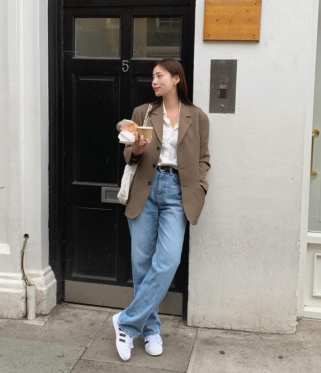 Đơn giản nhưng không bao giờ nhàm chán là công thức áo sơ mi trắng kết hợp với quần jeans xanh và áo blazer. Bộ trang phục này trang nhã, nhưng vẫn có nét tươi sáng, do đó "hack" tuổi hiệu quả. Đôi sneaker trắng tăng thêm vẻ năng động cho outfit, nhưng vẫn duy trì vẻ thanh lịch, tinh tế.