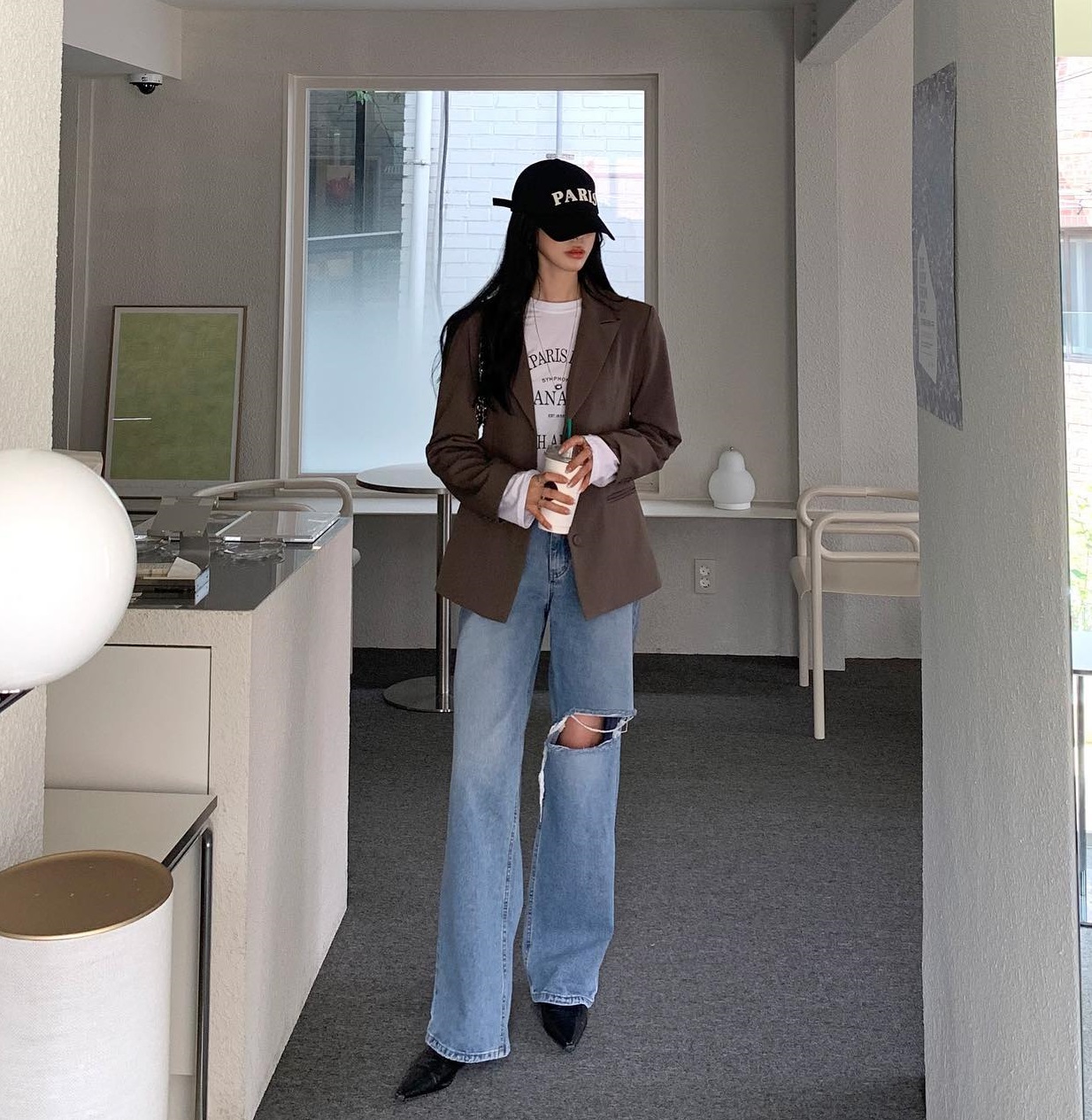 Yêu thích phong cách cá tính, bụi bặm thì chị em đừng bỏ qua công thức áo thun họa tiết và quần jeans rách. Chiếc áo blazer khoác ngoài giúp bộ đồ thêm tinh tế, nhưng vẫn có sự thời thượng. Để vóc dáng không bị "dìm", chị em đừng quên sơ vin và đi giày mũi nhọn.