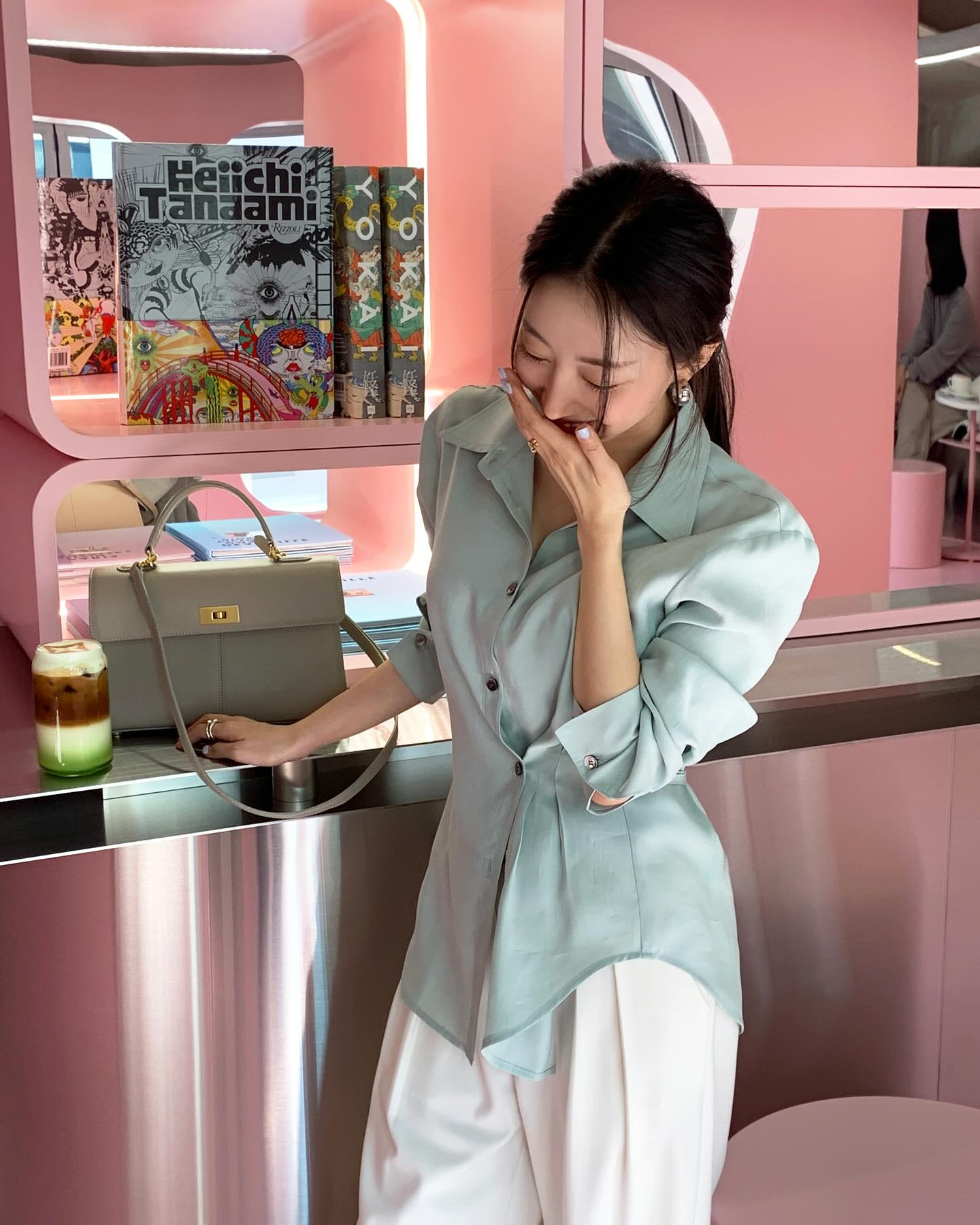 Áo sơ mi màu pastel kết hợp vô cùng ăn ý với quần âu trắng để tạo nên bộ đồ tươi sáng, trẻ trung. Công thức này còn có sự trang nhã, phù hợp với môi trường công sở. Chi tiết nhấn eo giúp tăng độ chỉn chu, đồng thời tôn dáng cao ráo mà không cần sơ vin.
