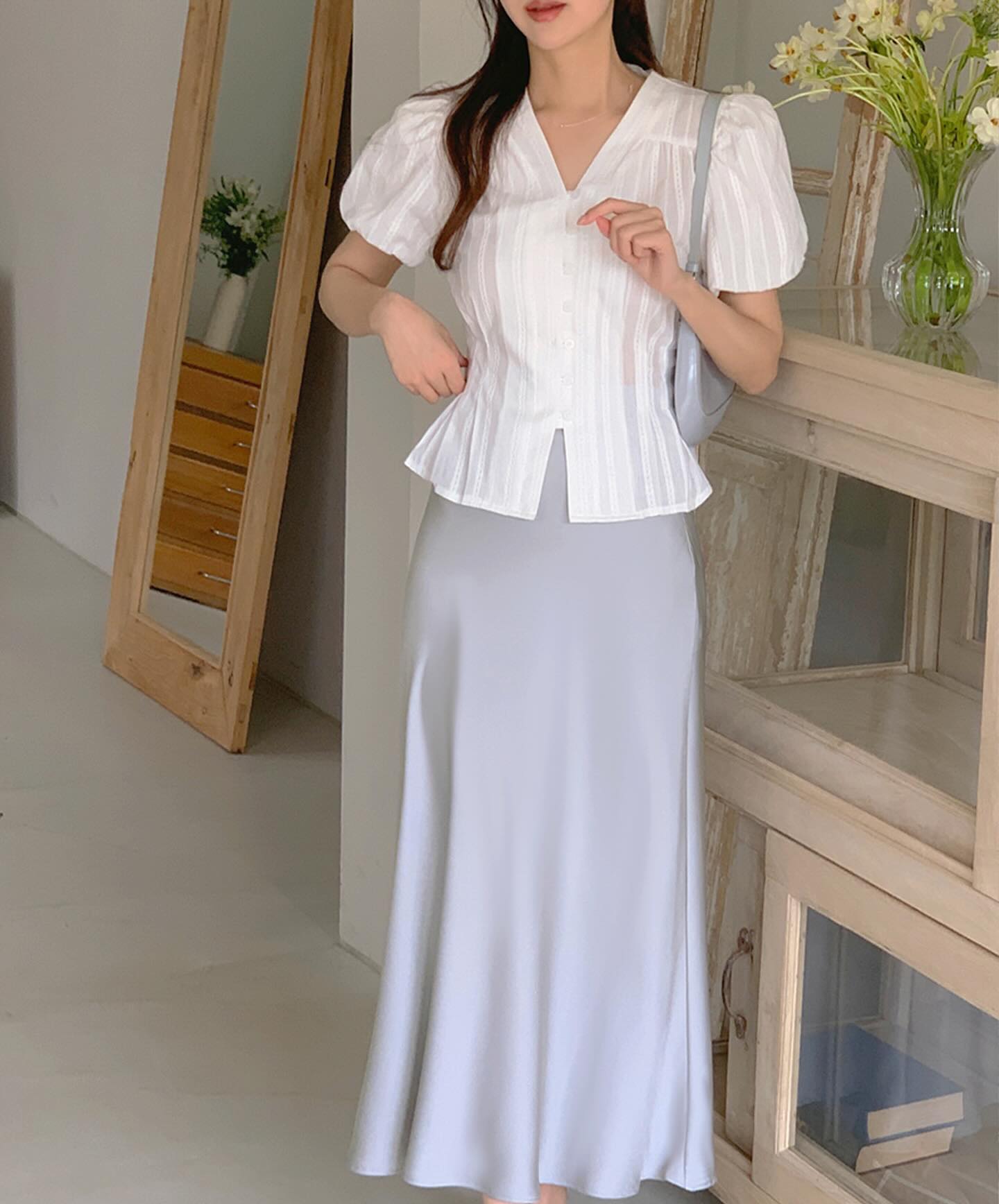 Mẫu áo blouse tay bồng ghi điểm ở sự sang trọng, yêu kiều. Khi kết hợp mẫu áo này với chân váy lụa, xanh pastel, chị em sẽ có được tổng thể trang phục đậm chất nữ tính. Outfit trên cũng rất dịu mắt, thích hợp để diện trong ngày nắng nóng.