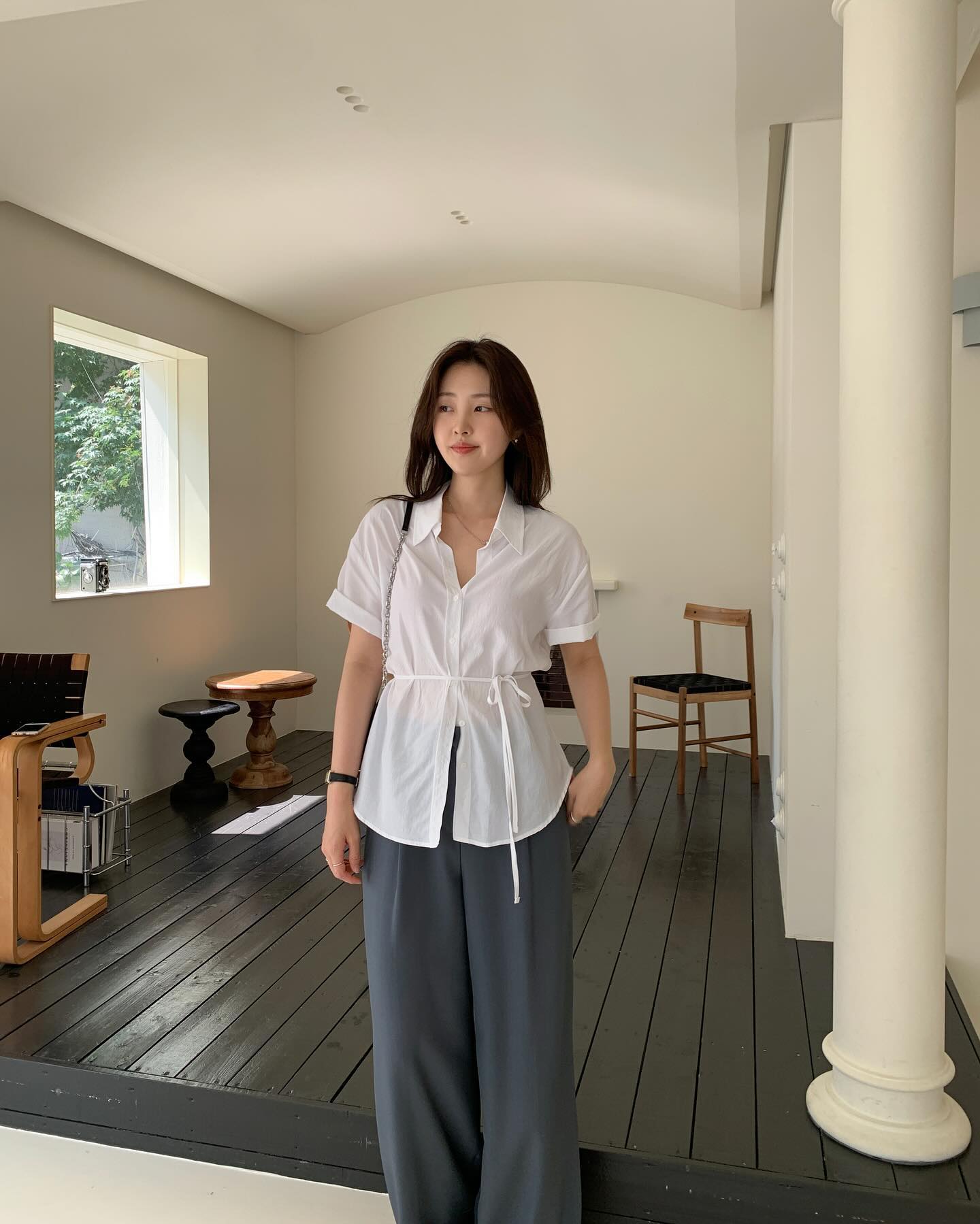 Thay vì kết hợp áo sơ mi trắng với quầu âu màu đen, chị em hãy diện cùng quần xám để có vẻ ngoài tươi sáng hơn. Nhờ chi tiết nhấn eo của áo sơ mi trắng, người diện không cần sơ vin mà vẫn có được tổng thể gọn gàng, tôn dáng tới công sở.