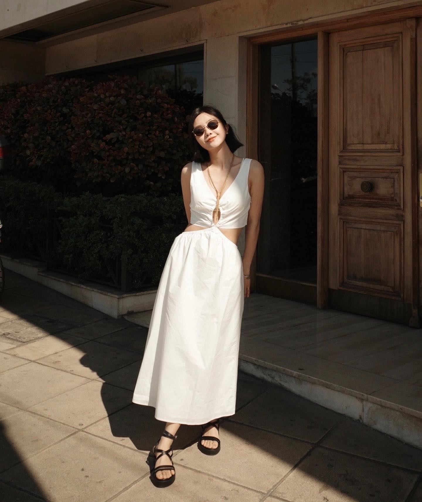 Diện váy trắng nhưng quý cô trên trông vẫn rất nổi bật, cuốn hút nhờ thiết kế cut-out quyến rũ. Thay vì đi các mẫu giày nữ tính, dịu dàng như giày cao gót mũi nhọn, giày búp bê, nàng tóc ngắn hãy thử kết hợp sandal với váy để tạo nên bộ trang phục thời thượng, phóng khoáng.