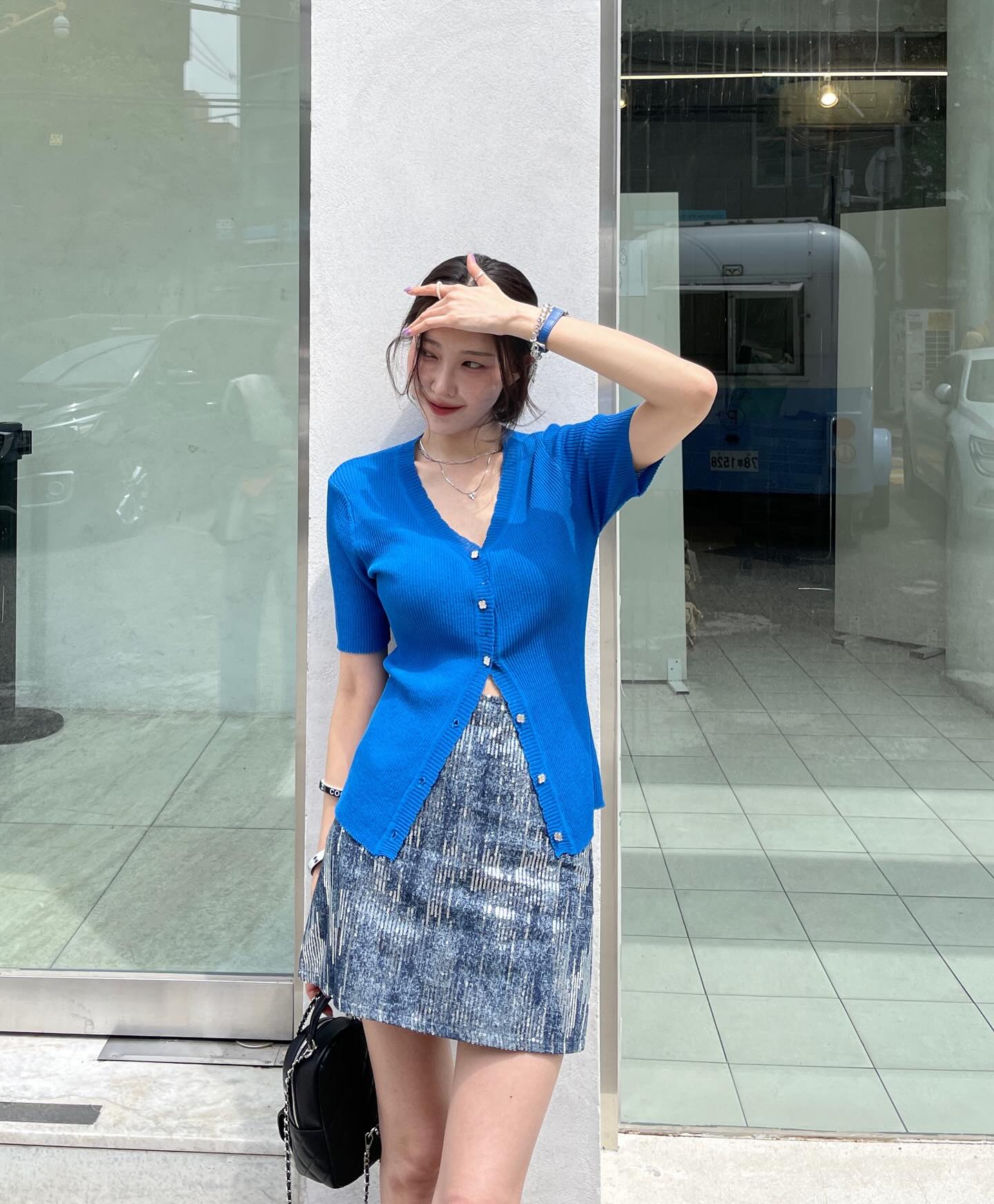 Nổi bật nhưng vẫn sang xịn mịn là ưu điểm của công thức gồm áo dệt kim màu xanh đậm kết hợp với chân váy ngắn. Với thiết kế áo xẻ tà, ôm nhẹ vóc dáng, chị em không cần sơ vin mà tổng thể vẫn có độ cao ráo, thanh thoát.