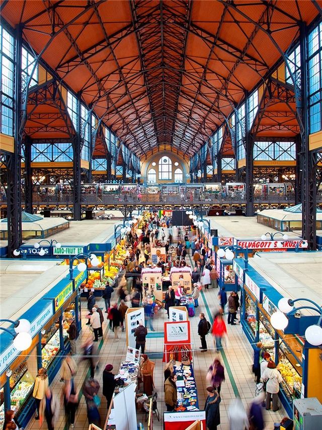 Điểm dừng chân đầu tiên cho bất kỳ người yêu ẩm thực nào khi đến thăm Budapest nên là chợ Central Market Hall. Ở đây đầy rẫy những món ăn ngon lành, các loại thực phẩm tươi, salamis, rượu vang địa phương, cùng các món ăn vặt đường phố có từ lâu đời như xúc xích nhồi trong ổ bánh hình nón, lagos (bánh bột chiên phủ kem chia và phô mai).
