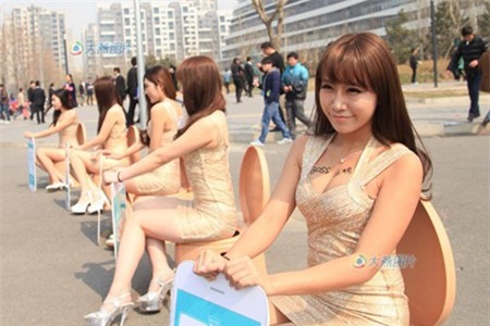 Để quảng cáo cho một công ty về công nghệ thông tin, một dàn chân dài mặc váy ngắn bó sát đã tạo dáng bằng cách ngồi trên bồn cầu ở khu trung tâm thương mại Wangjing, Bắc Kinh. Hoạt động quảng bá diễn ra vào giờ ăn trưa và thu hút rất nhiều nhân viên văn phòng trong khu vực hiếu kỳ tới xem.