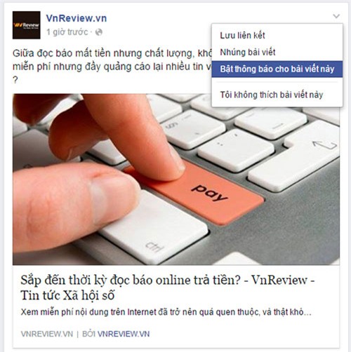 Bạn có thể bật thông báo để nhận thông tin được cập nhật cho một bài viết nào đó (lượt thích, bình luận, …) bằng cách nhấp vào nút Bật thông báo cho bài viết này.