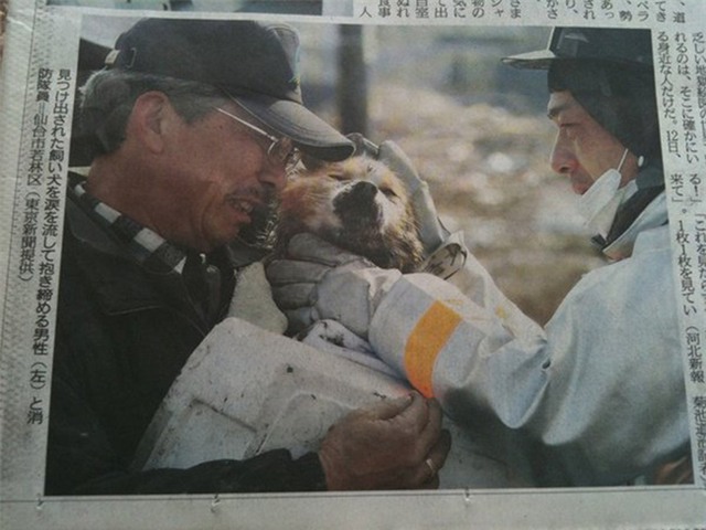 Một người đàn ông bật khóc vì được đoàn tụ cũng chú chó cưng sau thảm họa động đất sóng thần ở Nhật Bản vào năm 2011.