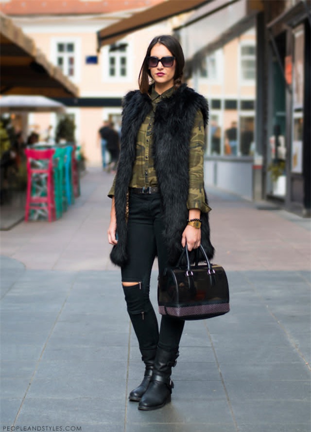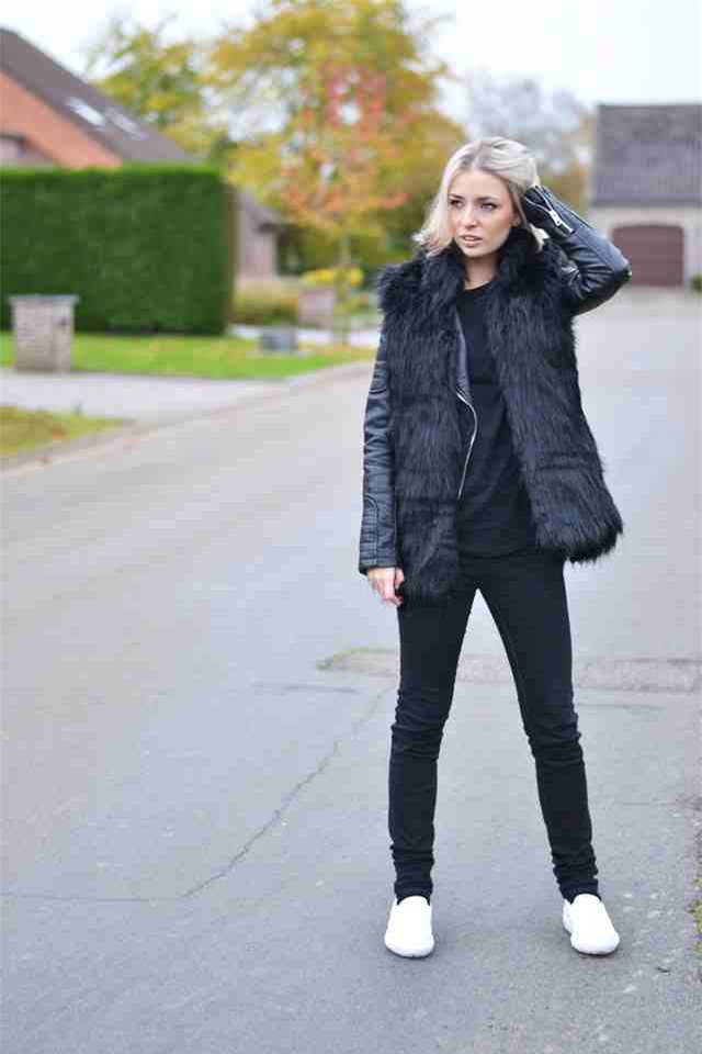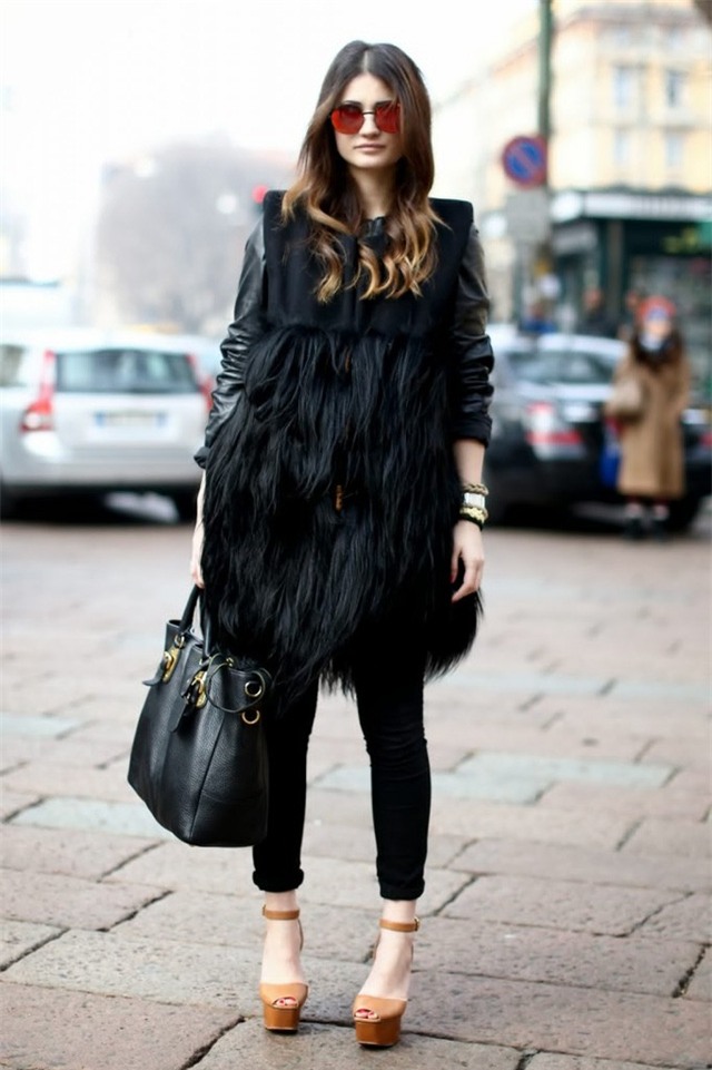 1. Thêm chút nổi bật và sang trọng cho set đồ màu đen của bạn với chiếc áo vest gile lông phối da cá tính và ấm áp.
