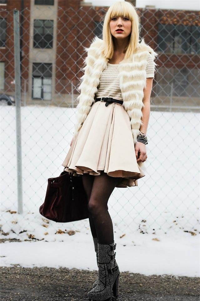9. Một trong những cách phối đồ cá tính là kết hợp áo khoác lông thú, áo sơ mi dài tay với chân váy lông. Bạn sẽ vô cùng ấm áp và sành điệu với set đồ này. Tuy nhiên nếu chọn chân váy lông xòe bồng bạn nên mix cùng áo khoác lông mỏng hơn để tránh rườm rà và không như một cục bông di động nhé.