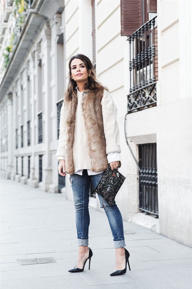 11. Hãy sẵn sàng cho mùa lạnh vẫn ấm áp và thời trang với những chiếc áo gile lông sành điệu và sang trọng. Set đồ màu be nữ tính, thanh lịch nhưng không kém phần quyến rũ.
