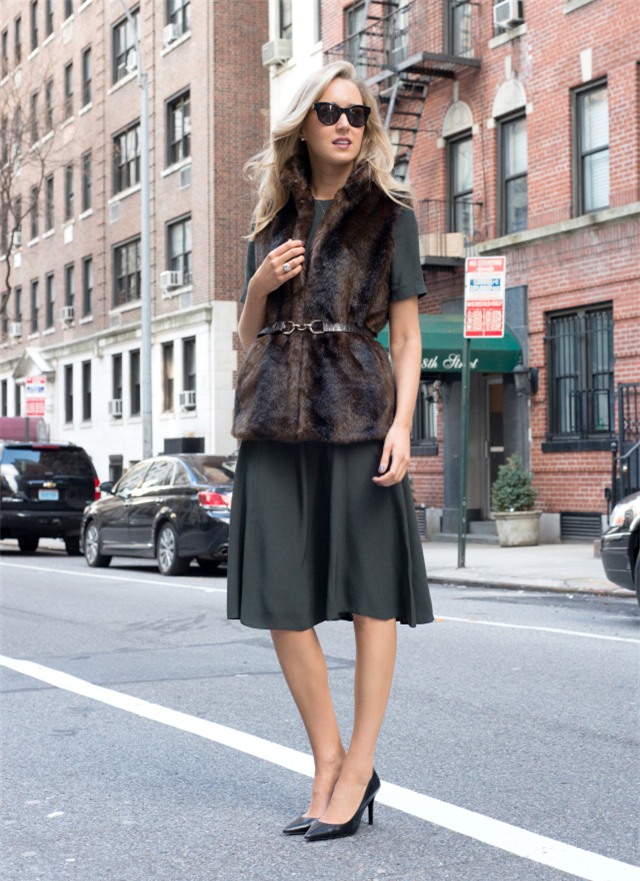 5. Nếu bạn nghĩ rằng áo vest lông chỉ được mặc cùng với quần thì hoàn toàn sai lầm nhé. Bạn có thể mặc vest lông với một chiếc váy liền và dùng dây thắt lưng cố định. Đây là set đồ nữ tính hoàn hảo cho mùa lạnh.