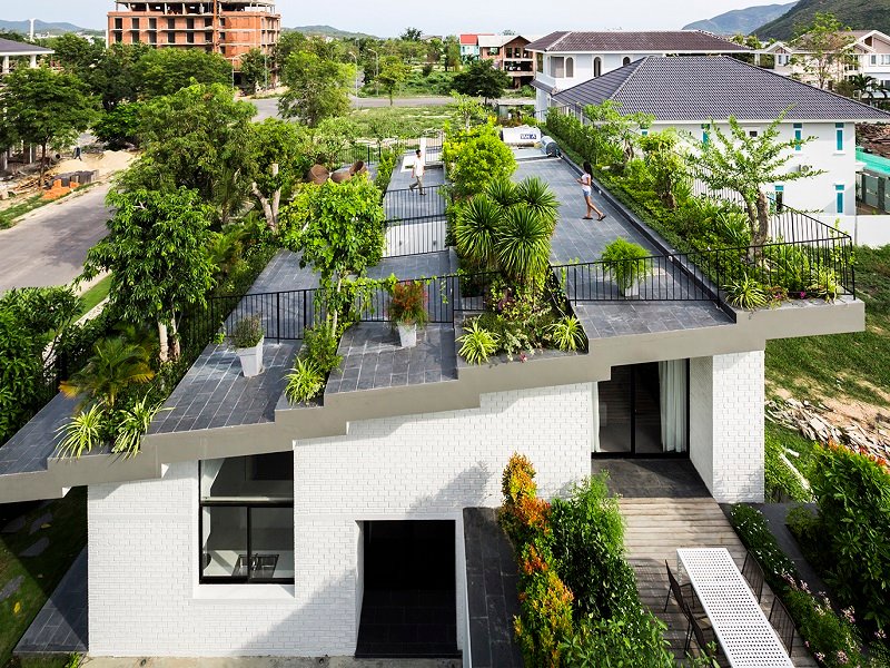 Căn nhà với phần mái được biến tấu thành một khu vườn cây xanh. Việc này giúp trực tiếp hạ nhiệt cho ngôi nhà khi nắng nóng. Tuy nhiên cần phải xử lý chống thấm, thoát nước thật tốt để không làm hỏng mái cũng như kết cấu ngôi nhà.