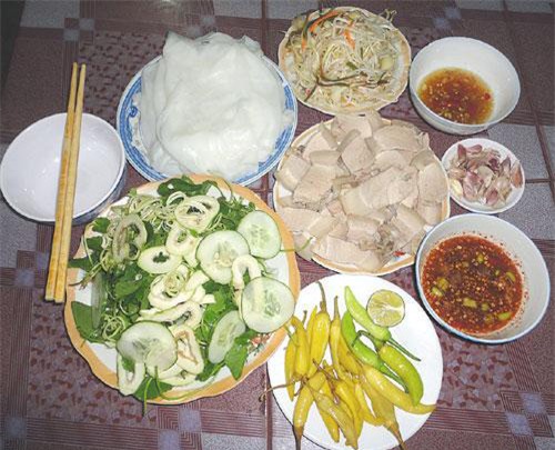 Ăn cùng với bánh ướt là rau sống và tất nhiên là không thể thiếu đó là thịt heo luộc.
