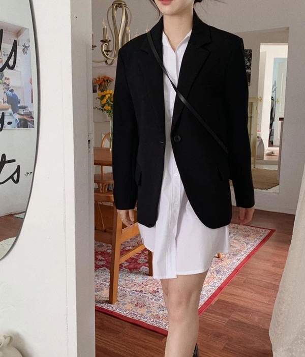Outfit gồm váy sơ mi ngắn + blazer này gây ấn tượng ở sự trẻ trung, sexy mà vẫn cực cool ngầu, thời thượng.