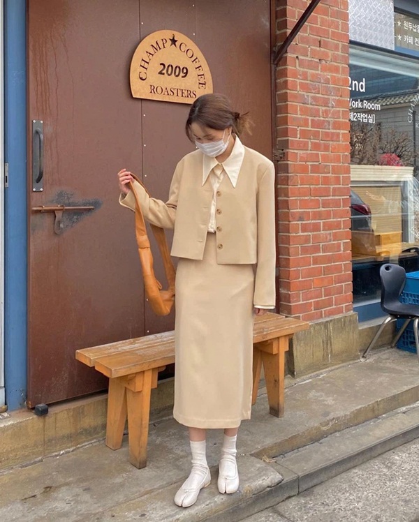 Combo áo khoác + váy đồng bộ này nhanh chóng cho bạn vẻ ngoài trang nhã, thanh lịch mà vẫn trẻ nhờ gam màu be. Để giữ nguyên sự tinh tế và sáng sủa cho outfit, bạn hãy layer bên trong một chiếc áo sơ mi trắng kem nhé!