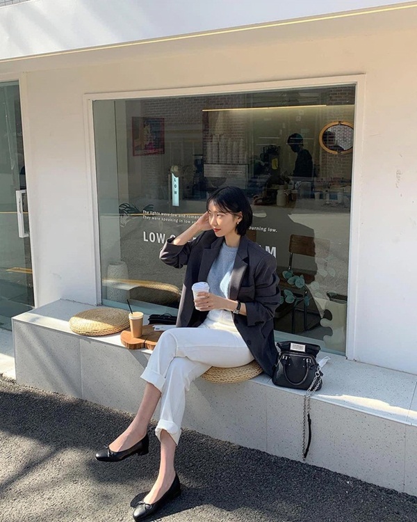 Bộ đôi áo blazer + quần trắng sẽ đưa vẻ ngoài của bạn chạm đến đỉnh cao của sự thanh lịch, tinh tế nhưng vẫn trẻ trung. Với bộ đôi này thì bạn chỉ cần diện bên trong chiếc áo len tăm mỏng cho nhẹ nhàng, thoải mái. Kết lại set đồ, một đôi búp bê đơn giản sẽ là mảnh ghép hoàn hảo.