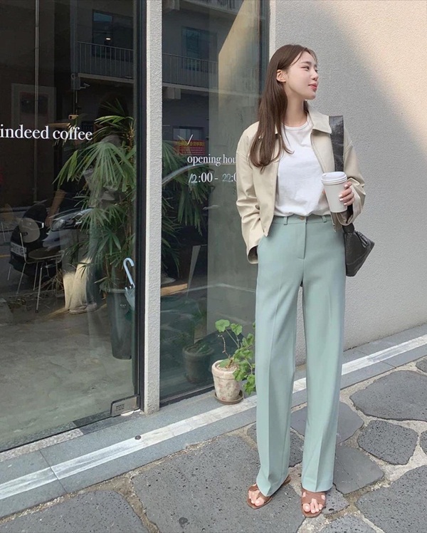 Item ăn điểm nhất của set đồ này chính là chiếc quần âu màu xanh pastel, trông vừa dịu mắt vừa trẻ trung. Để chinh phục xuất sắc mẫu quần này, bạn hãy mix với áo thun trắng, khoác ngoài một chiếc áo mỏng nhẹ cũng mang tông màu trang nhã nhé!