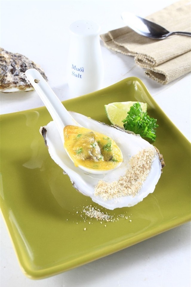 Hàu phô mai đút lò có hương thảo, lá gia vị trong món Âu, thơm và đậm đà. Ảnh: Hoàng Thụy.