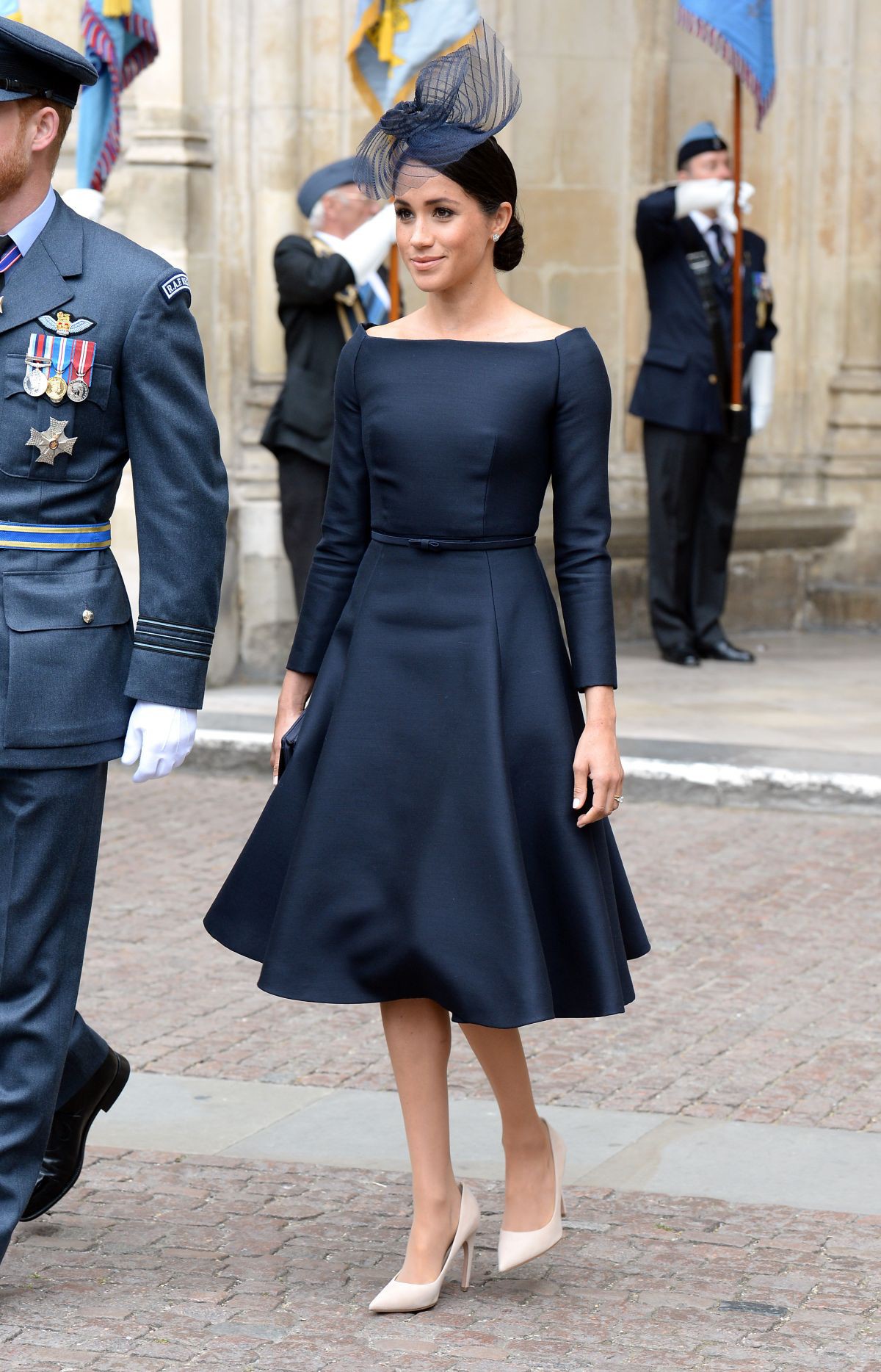 Trong lễ kỷ niệm 100 năm thành lập lực lượng Không quân Hoàng gia Anh, Công nương Meghan xuất hiện sang trọng, trang nhã tuyệt đối trong thiết kề đầm của Dior. Cô còn thể hiện sự tinh tế của mình khi kết hợp chiếc đầm đen cổ thuyền với giày cao gót mũi nhọn màu trắng kem giúp tổng thể thêm hài hòa, thanh lịch.