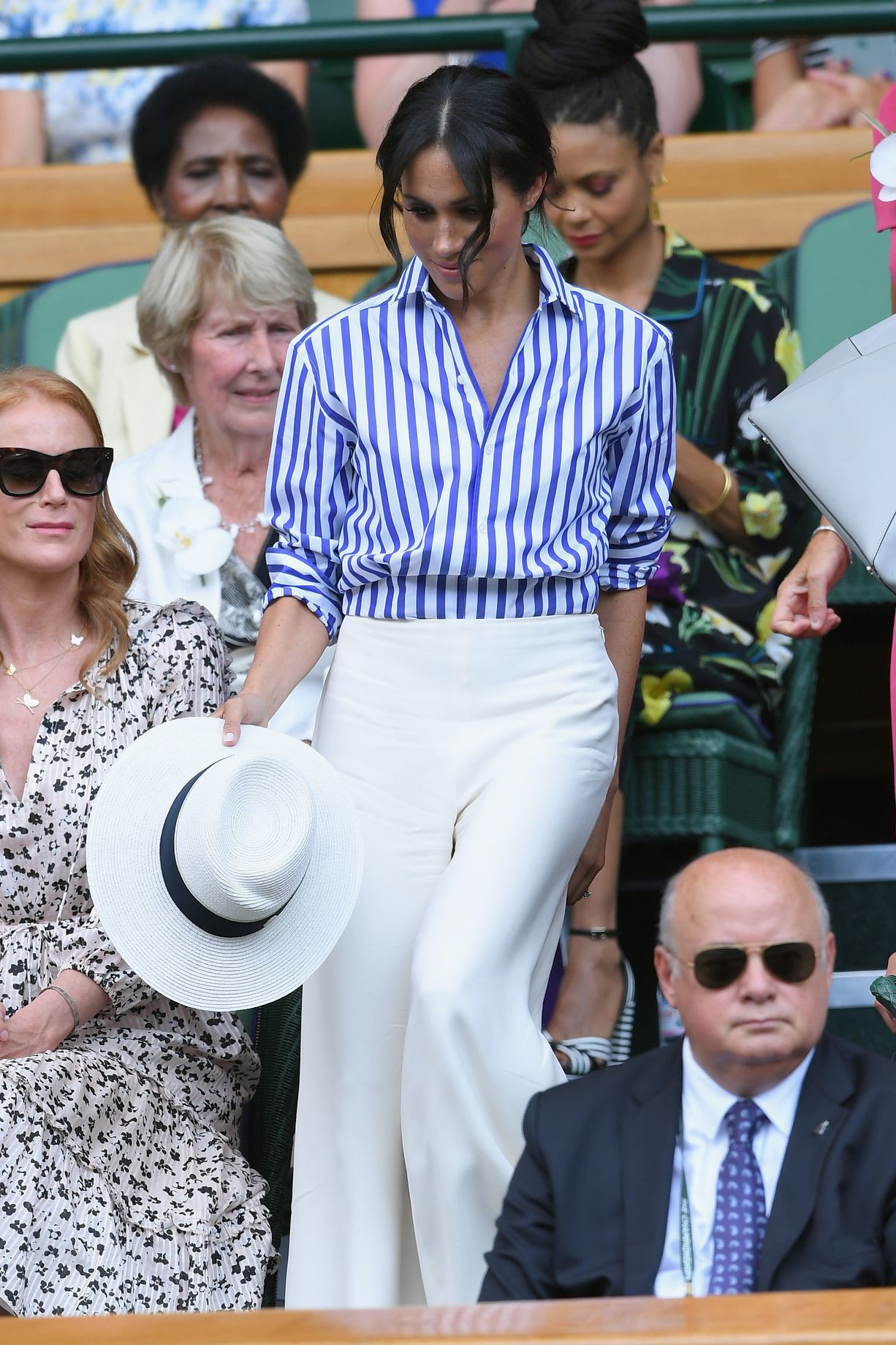 Tại giải quần vợt Wimbledon, Công nương diện bộ cánh hết sức trẻ trung, năng động nhưng vẫn không làm mất đi nét thanh lịch của một nàng dâu Hoàng gia với áo sơ mi kẻ sọc mix cùng quần vải dáng suông.