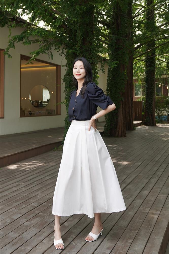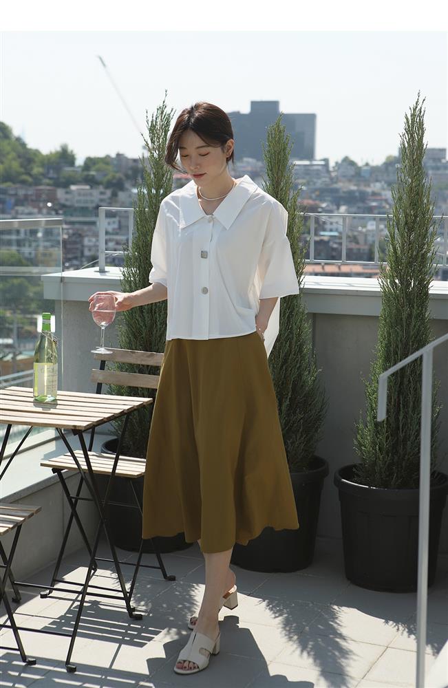 Công thức áo blouse trắng + chân váy xòe màu xanh rêu này gây ấn tượng ở sự phóng khoáng. Nhờ chọn mẫu áo phom dáng lửng, chị em sẽ không cần phải sơ vin, vóc dáng vẫn cao ráo. Muốn tăng hiệu quả hack chiều cao, chị em hãy chọn một đôi mule thoáng chân nhé!