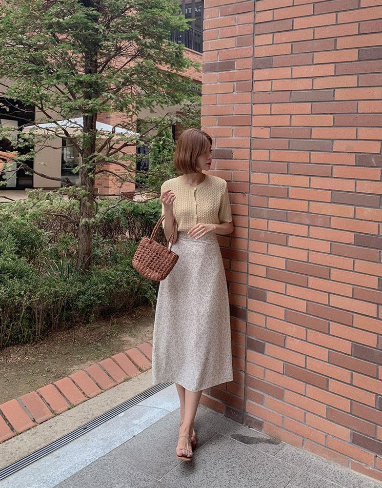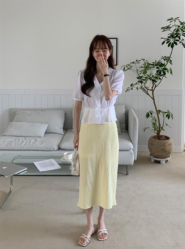 Chân váy màu vàng pastel đã giúp làm nổi bật cả set đồ, nhưng nét trang nhã vẫn không hề thuyên giảm. Chất liệu vải của set trang phục rất nhẹ mát, hoàn hảo để chị em áp dụng trong những ngày hè nóng đỉnh điểm.