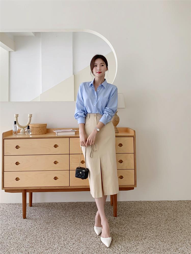 Áo sơ mi màu pastel đang là mốt. Cách diện mẫu áo này cũng rất đơn giản, chị em hãy kết hợp cùng với chân váy trắng kem, hai món đồ này sẽ tạo nên outfit nữ tính, trẻ trung và chuẩn thanh lịch. Để không làm ảnh hưởng đến nét nhã nhặn của bộ đồ, một đôi giày trắng là lựa chọn hoàn hảo.